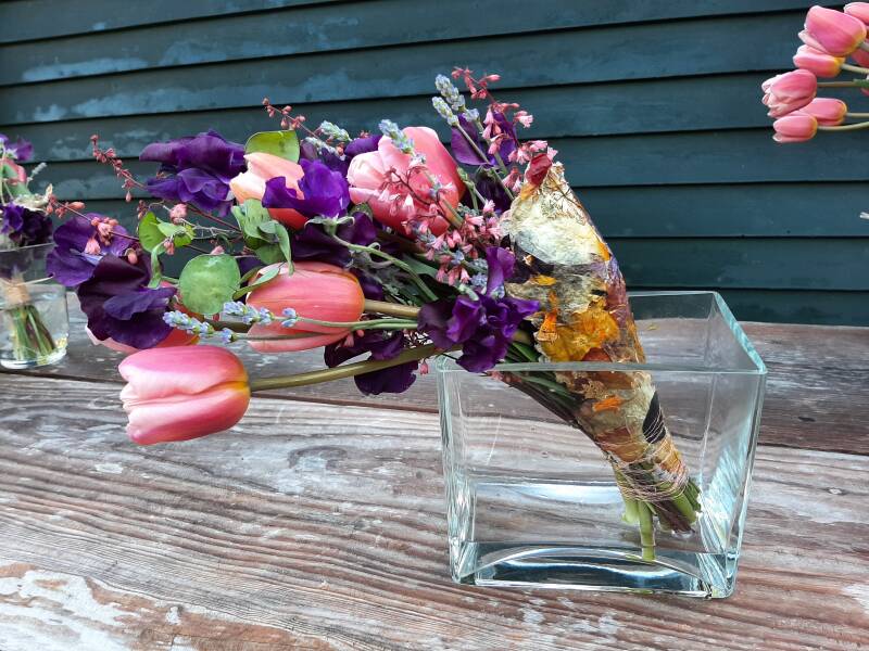 Een tulp is al mooi met een eenvoudig papiertje eromheen. Hij groeit door en past daardoor niet zo in een decoratief bloemwerkje.